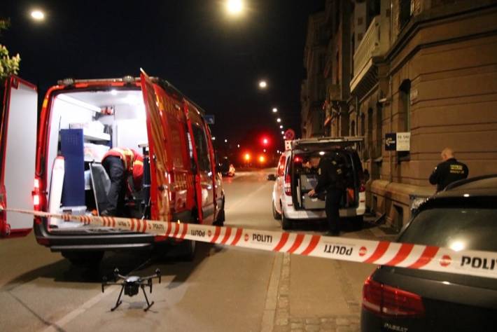 Politiet var mødt op i kampklædt uniform, og de havde sat to droner i luften. Samtidig var et større område omkring Ole Suhrsgade afspærret.